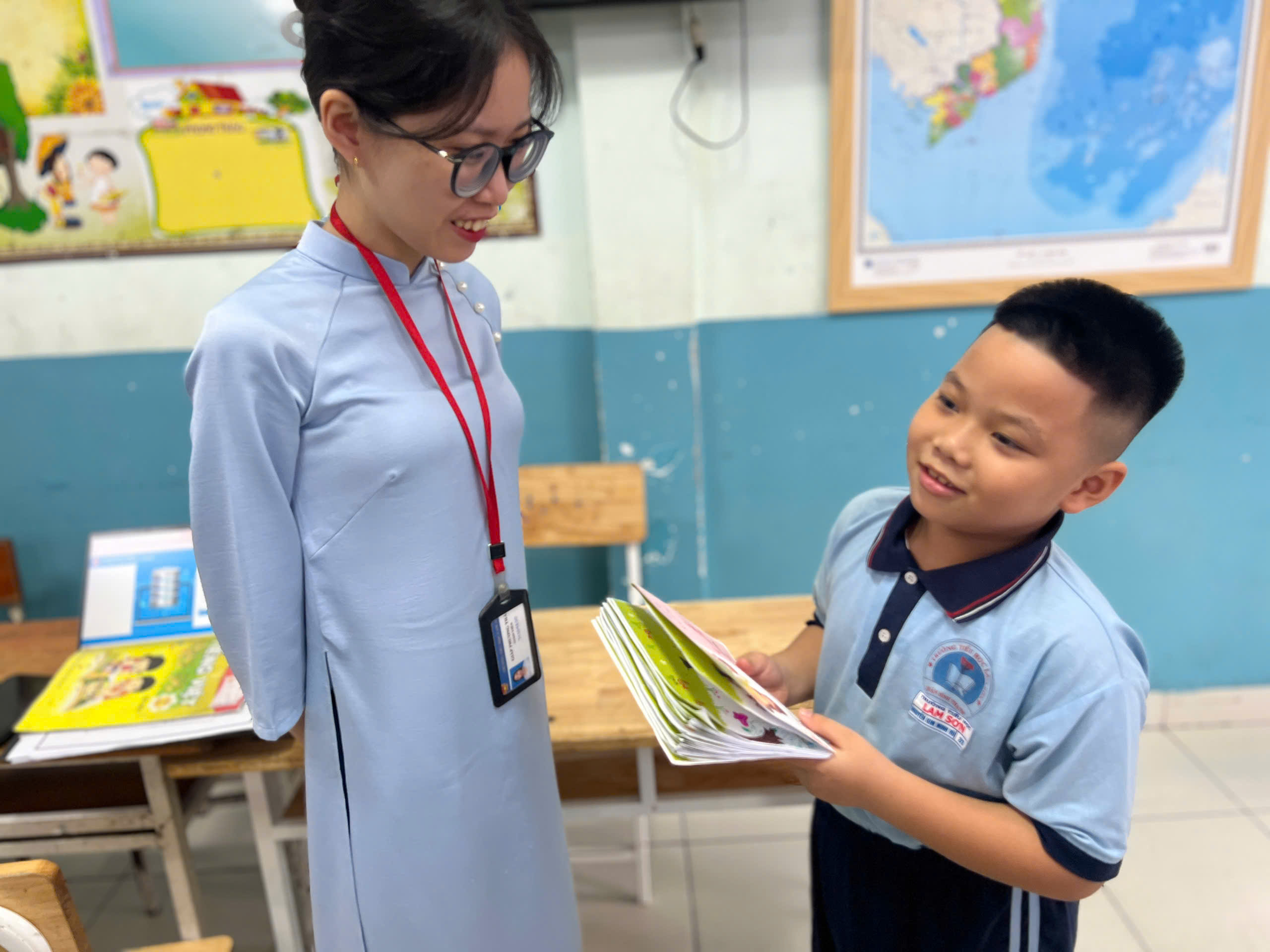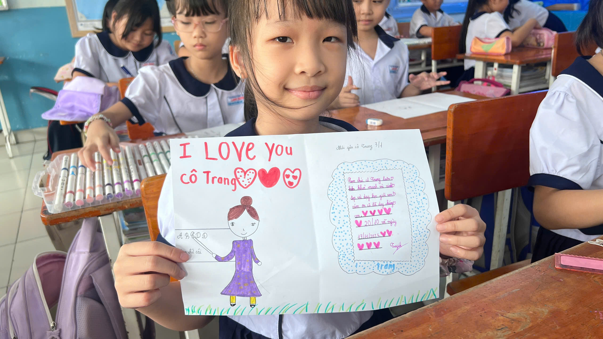 Trong quá trình thực hiện, học sinh cùng nhau chia sẻ về những kỷ niệm đáng nhớ với thầy cô, những điều các em yêu thích trong các tiết học và những lời chúc tốt đẹp gửi đến thầy cô. Không khí lớp học trở nên vui vẻ và ấm áp khi các em hào hứng trang trí sản phẩm của mình bằng nhiều màu sắc khác nhau, sau đó cùng nhau trưng bày trong lớp như một góc nhỏ tri ân thầy cô.