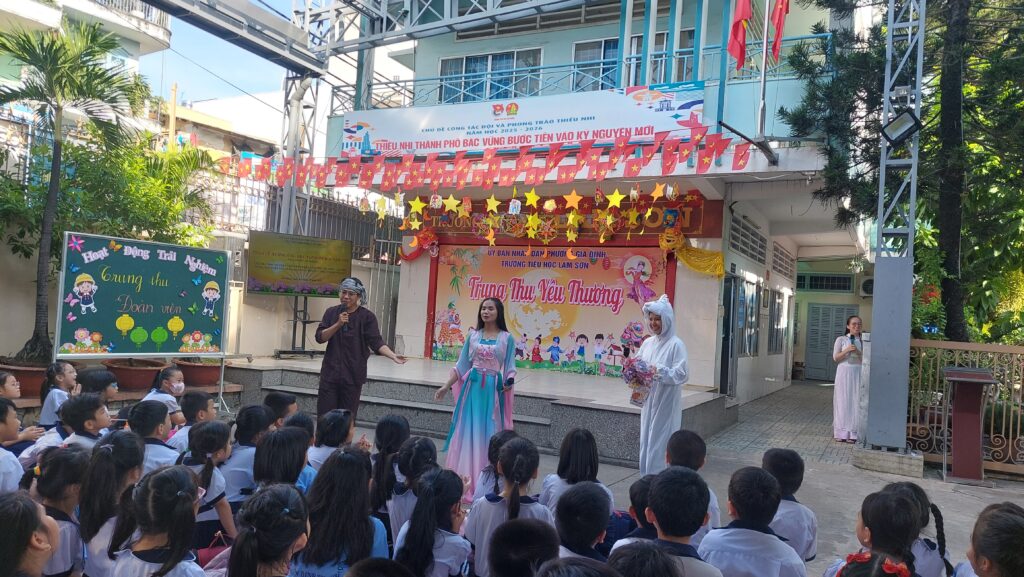 Bên cạnh các hoạt động trong lớp, Đông Dương còn phối hợp tổ chức chương trình “Trung thu yêu thương” tại Trường Tiểu học Lam Sơn với nhiều hoạt động sôi nổi dành cho học sinh. Tại chương trình, các em được tham gia các trò chơi tập thể, giao lưu cùng bạn bè, thưởng thức các tiết mục văn nghệ và chụp hình lưu niệm trong không khí rộn ràng của ngày hội. Không gian chương trình được trang trí với đèn lồng, hình ảnh chú Cuội, chị Hằng và các biểu tượng quen thuộc của Tết Trung thu, tạo nên một bầu không khí vui tươi và gần gũi.