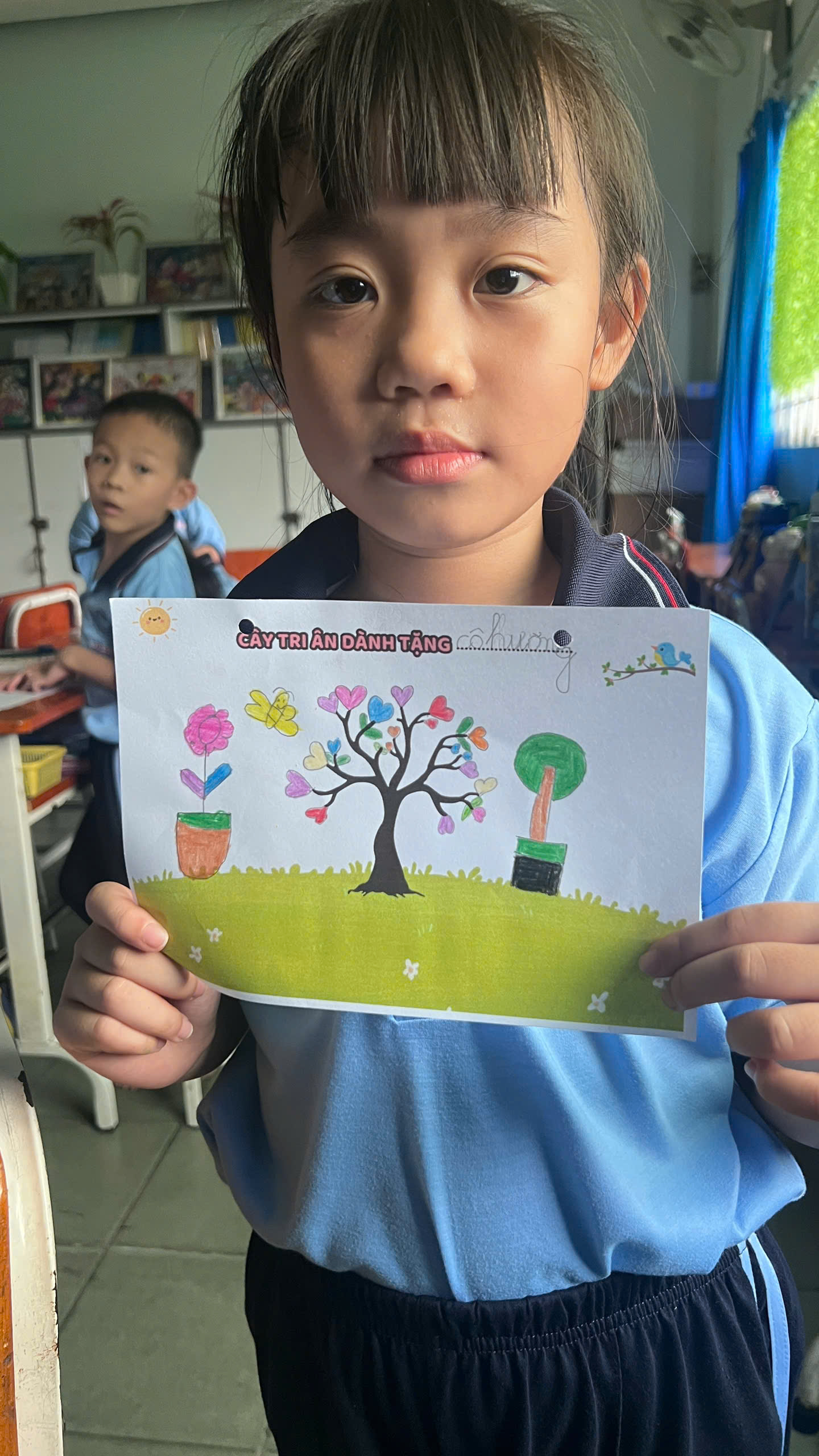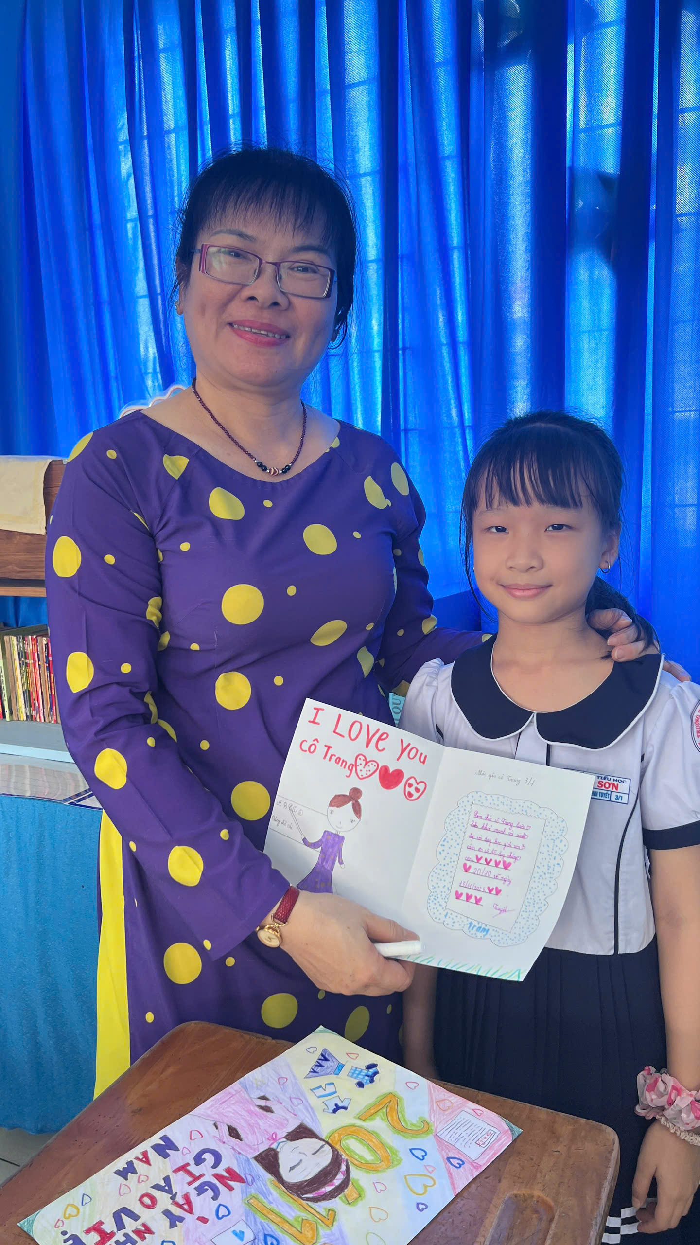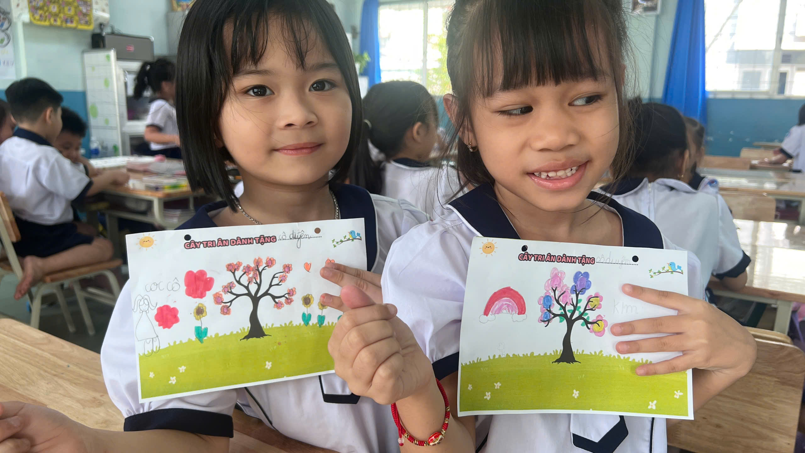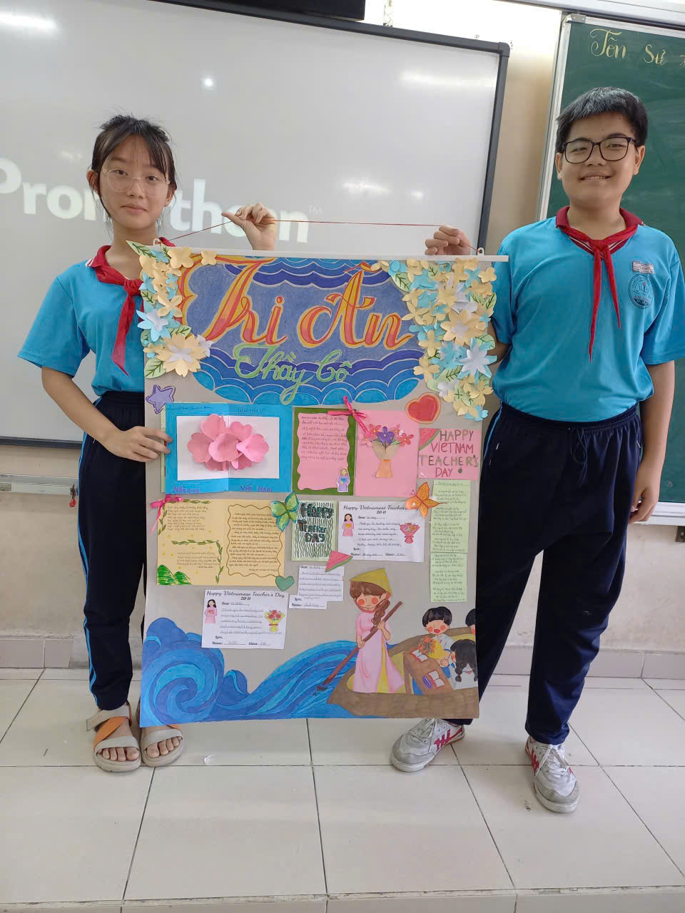 Trong quá trình thực hiện, học sinh cùng nhau chia sẻ về những kỷ niệm đáng nhớ với thầy cô, những điều các em yêu thích trong các tiết học và những lời chúc tốt đẹp gửi đến thầy cô. Không khí lớp học trở nên vui vẻ và ấm áp khi các em hào hứng trang trí sản phẩm của mình bằng nhiều màu sắc khác nhau, sau đó cùng nhau trưng bày trong lớp như một góc nhỏ tri ân thầy cô.