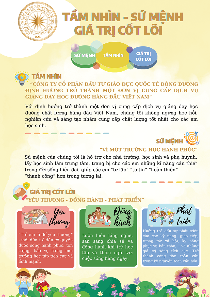 Đinh hướng trở thành một đơn vị cung cấp dịch vụ giảng dạy học đường hàng đầu Việt Nam, với định hướng ấy, chúng tôi không ngừng học hỏi, nghiên cứu và sáng tạo nhằm trang bị cho các em những kĩ năng cần thiết trong đời sống hiện đại, giúp các em “tự lập”, “tự tin””, “hoàn thiện”, “thành công” hơn trong tương lai